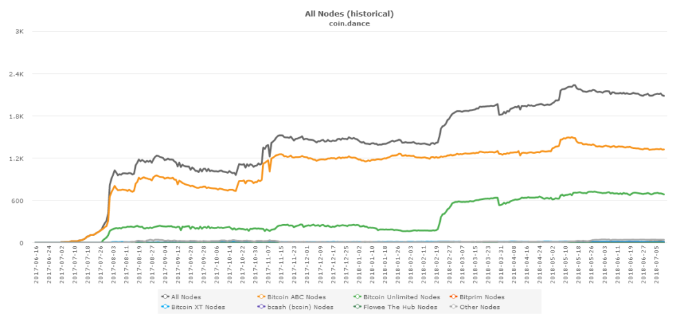 A glimpse at the current node statistics meanwhile shows the additional presence of just four curious “BCash” nodes, in existence since May.