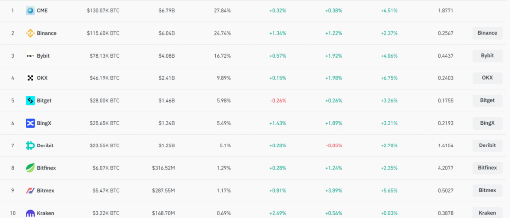 According to data from Coinglass, Bitcoin contract holdings on major US dollar-denominated exchanges have reached a staggering $22.84 billion. This marks a significant milestone, closely mirroring the heights of November 9, 2021, when open interest peaked at $23 billion. Leading platforms like CME, Binance, and Bybit hold significant shares, with CME taking the top spot at nearly $7 billion, followed closely by Binance at $6 billion and Bybit at $4 billion.