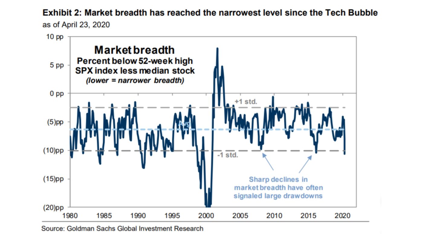 Strategists at Goldman Sachs found that the five largest companies now cover 20 percent of the S&P 500 index’s market capitalization. The US benchmark, on the whole, trades 17 percent down from its February 2020 top, but its median stock is about 28 percent up within the same timeframe.