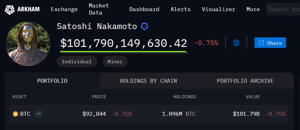Satoshi Nakamoto, the pseudonymous inventor who disappeared from public view more than a decade ago, holds approximately 1.1 million Bitcoin, according to data from analytics platform Arkham.