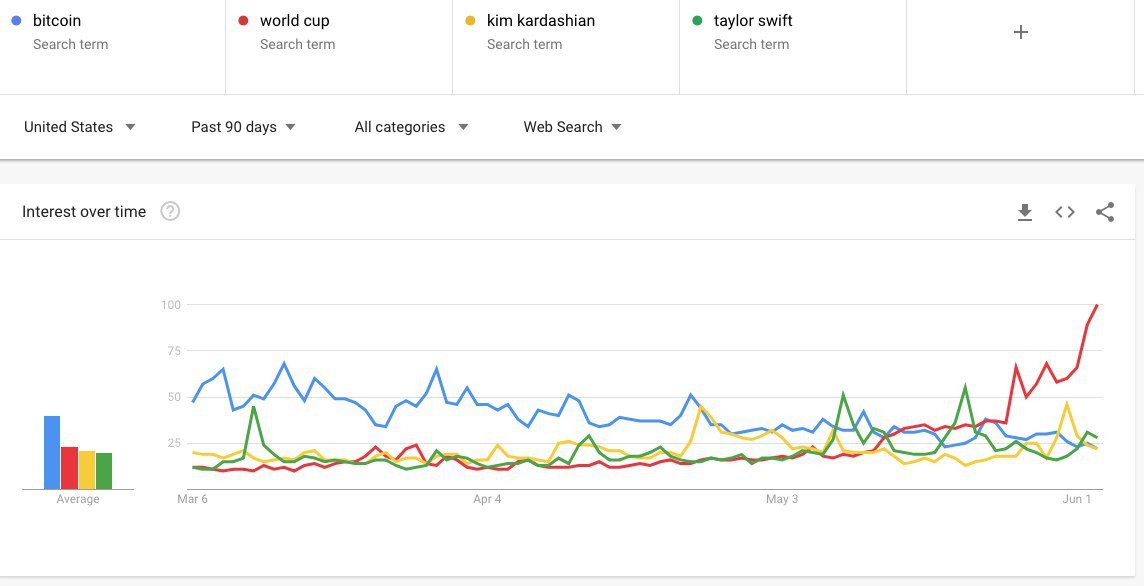 When we incorporate a few more popular search terms, we see that Bitcoin is more popular than Taylor Swift and even Kim Kardashian.