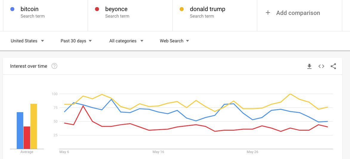 In the past month, searches for ‘Bitcoin’ have been greater than ‘Beyonce’, and are only a few points below ‘Trump’, who is arguably the most recognizable person in the world today.