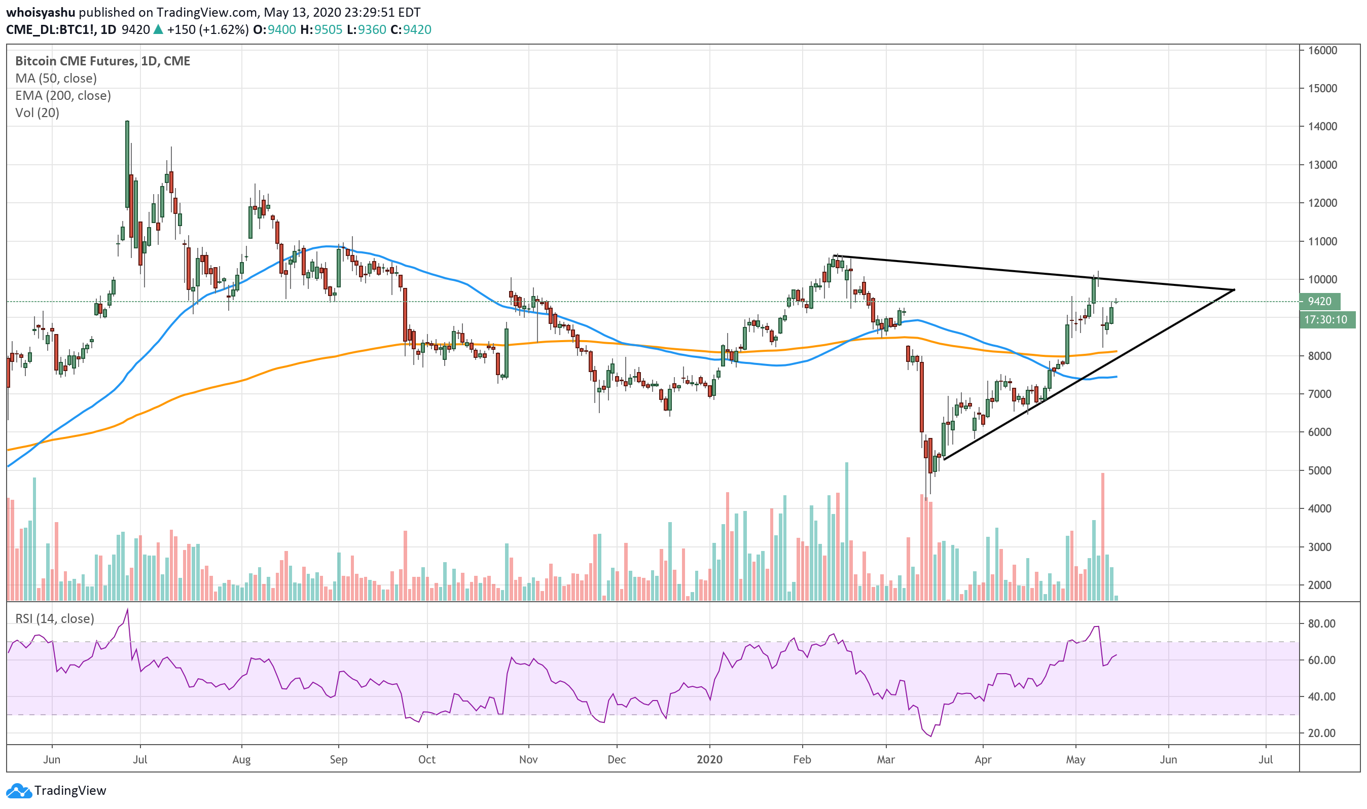 The benchmark cryptocurrency gained 6.79 percent, or $598, to $9,420 a token. Its CME futures rose 6.61 percent to $9,430.
