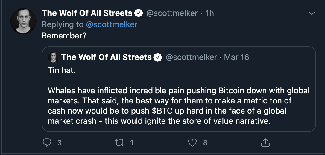Scott Melker, a prominent crypto trader, reminded that traders holding high quantities of bitcoin tokens (aka “whales”) were sitting atop “a metric ton of cash” after March sell-off. They used the money to push the bitcoin prices upward after the U.S. fiscal stimulus announcement.