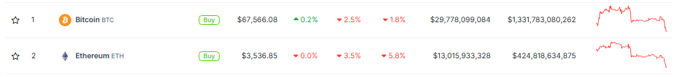 Bitcoin and Ethereum price action and market cap. Source: Coingecko
