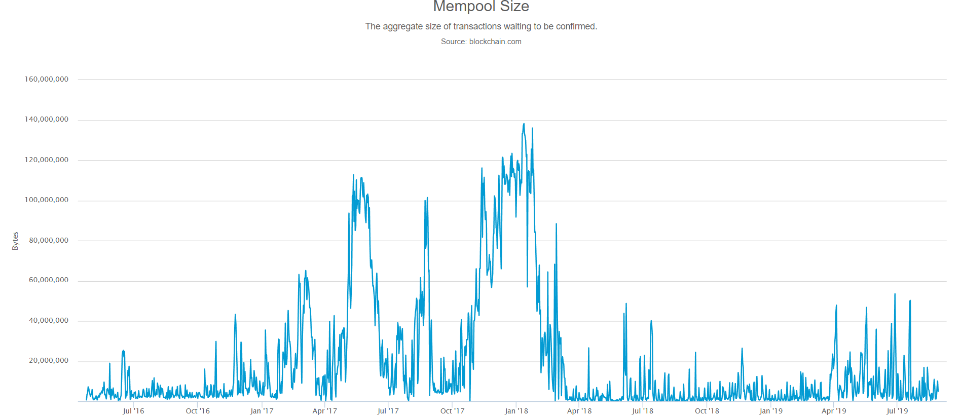 These charts show that during Dec. 2017, the average number of transactions confirmed per day was somewhere between 350k and 400k. This last month, Aug 2019 had an average of 300k to 350k transactions. So while the fees may be lower, there are also fewer transactions happening on the blockchain.