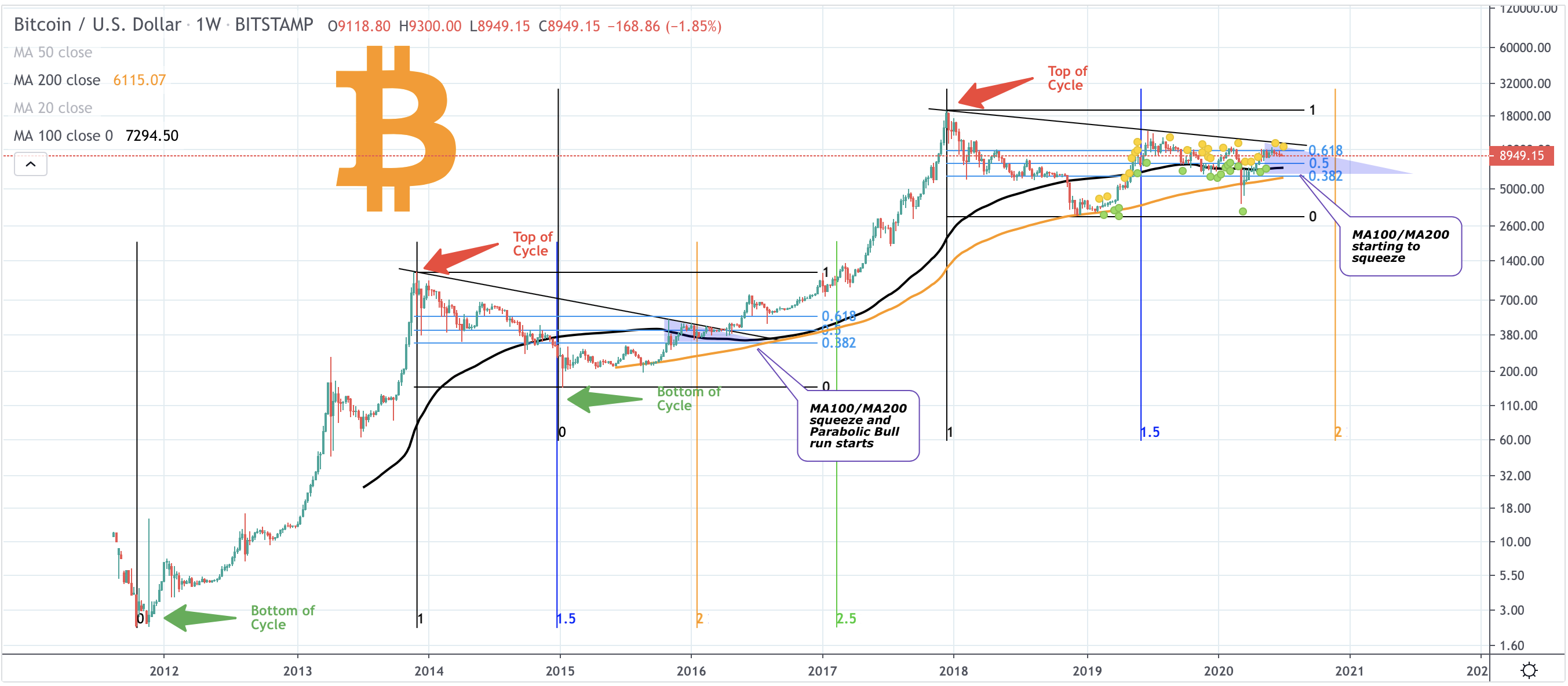 The ‘Cycle 2’, meanwhile, sees Bitcoin crashing towards $3,200 in December 2018. The price again reaches the 100-WMA. It consolidates above the 0.5 Fib line until the COVID-induced sell-off of March 2020 sends it back below the support. Nevertheless, Bitcoin retains the level as its support all over again.