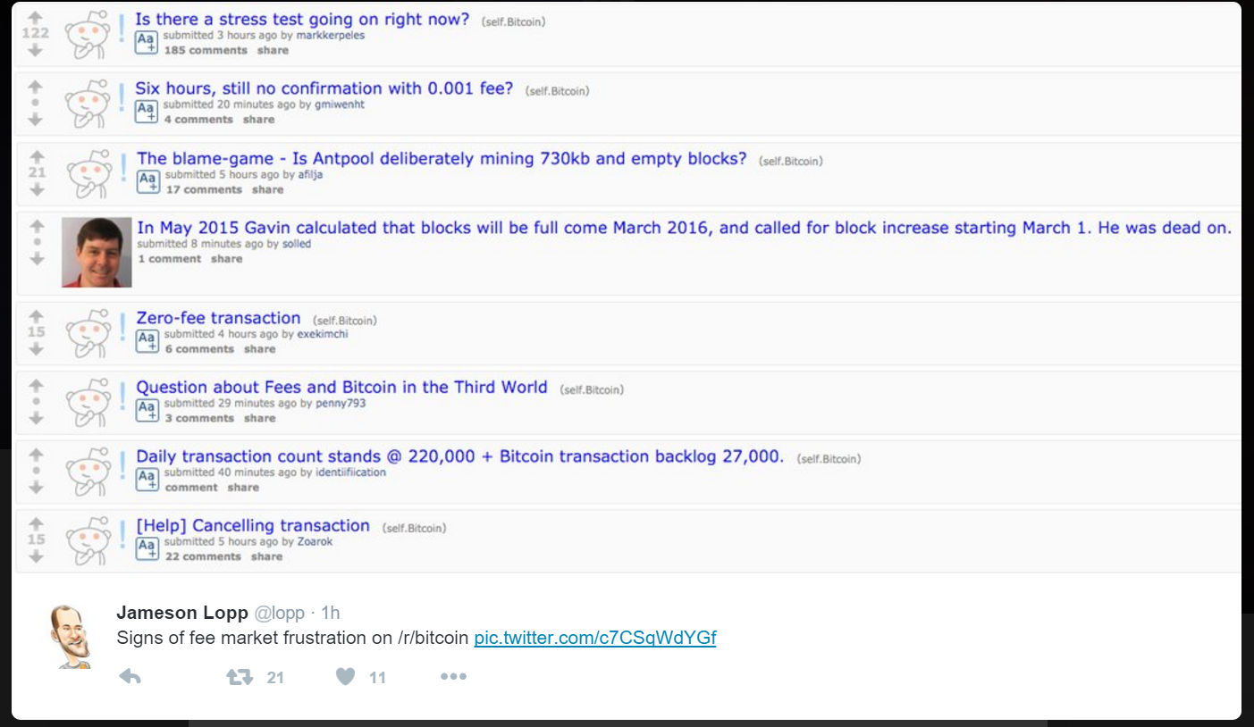 On r/bitcoin, a subreddit controlled by Theymos, notorious for censoring any anti-Core discussions, people immediately assumed spam or stress testing to be the culprit. One person outright asked, “Is there a stress test going on right now?” In the comments on other threads, debates considered the possibility of a spam attack, noting that sudden influx of small transactions with low fees. Others simply sought help, asking for advice on how to get their transactions through the network in a timely manner.