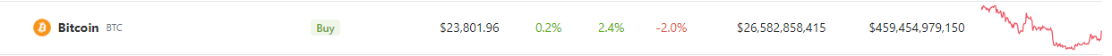 At the time of writing, Bitcoin was trading at $23,708, down 2.4% in the last seven days, data by Coingecko show.