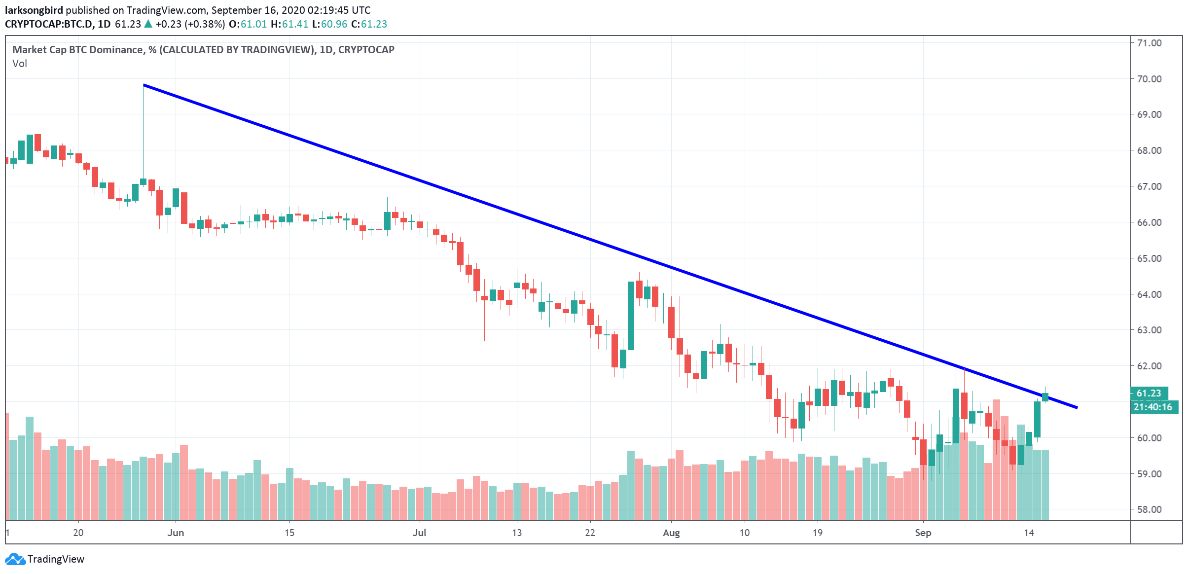 The polar-opposite sentiment appeared as Bitcoin Dominance–a barometer to measure the benchmark cryptocurrency’s market cap against the rest of the crypto market–crawled further back to higher levels. As observers noted, the BTC.D chart was looking for a breakout of its own, despite not being a tradable instrument.