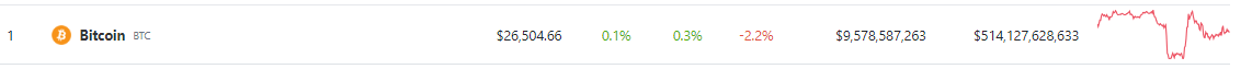 As per the latest data from CoinGecko, Bitcoin is currently priced at $26,504. Over the past 24 hours, the alpha coin has witnessed a modest rally, experiencing a 0.3% increase in value. However, in the previous seven days, Bitcoin lost 2.2% of its value.