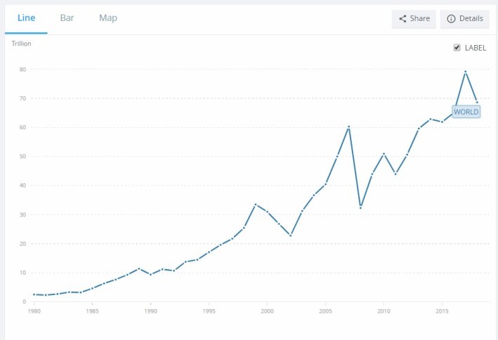 All in all, this comparison shows that the crypto market accounts for only a tiny fraction of the stock market. The total value of all the companies listed on stock exchanges around the world was $68.6 trillion in 2018, according to World Bank data.
