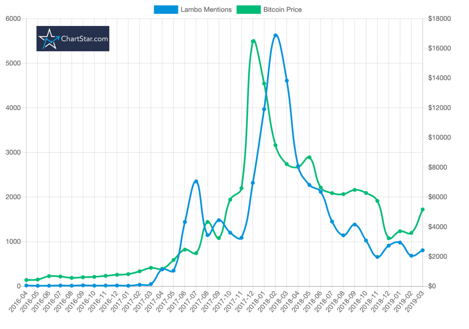 In May 2017, the Lambo line spiked high above the Bitcoin price line just before the asset went on a parabolic rally towards its all-time high above $20,000. Then, in April 2018, the Lambo line tanked below the Bitcoin price line a few months before BTC tanked to its bear market bottom around $3,400.