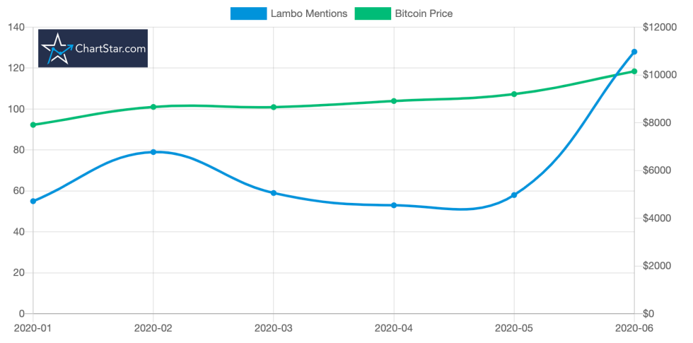 According to a blog post from ChartStar, the number of ‘Lambo’ mentions on Reddit turns out to be a surprisingly good indicator for predicting strong Bitcoin market moves.