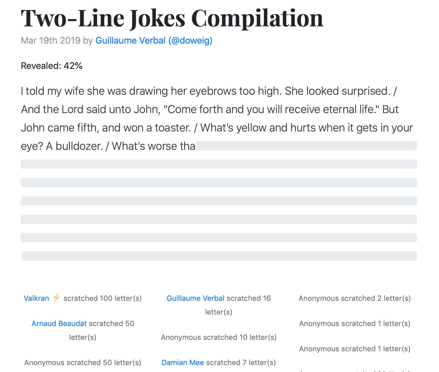 Would be readers then make lightning payments to ‘scratch off’ one or more letters for everybody to see. The content is fully revealed once the funding goal is reached, and payments go to the writer as letters are scratched. Patrons can choose to have their name and number of letters paid for displayed on the page.