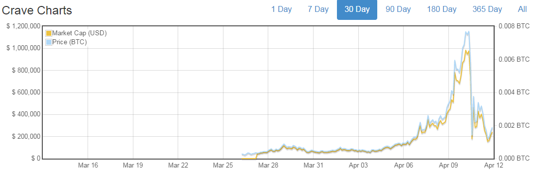 Crave, which was making enormous movement for the last two weeks or so, has had its 15 minutes of fame cut short. While Crave is surprisingly still up 22%, the current price of $0.28 is a far cry from the $2 mark that crave was very close to achieving just a few days ago.