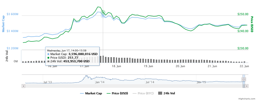 This week we saw volatility that was a lot, even for the relatively unstable Bitcoin market. The week started at a low of $230, spiking all the way up to the $260 range that totals to a nearly 13% increase in price. Like many people expected, however, the price quickly fell back down and is currently hovering at just above $240, coinciding with the prediction I made in last week’s Market Wrap-Up. Despite all the turbulence in price Bitcoin has received this week, Bitcoin still ends the week with approximately 4.5% net gain.