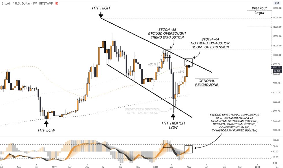 While looking at the above chart, he notes that the crypto was able to print a high-time-frame low at $3,800 in March, while the crypto’s Stoch momentum indicator signals that there is still room for expansion of its recent uptrend.