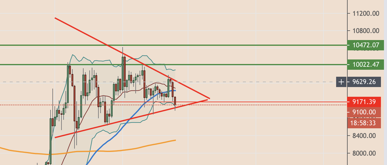 The Bitcoin price is fluctuating inside a trading range of $9,000 and $10,000 now for more than a month, data on TradingView.com shows. Looking at the tightened price moves through Bollinger Bands further implies a growing contraction in the cryptocurrency’s volatility.