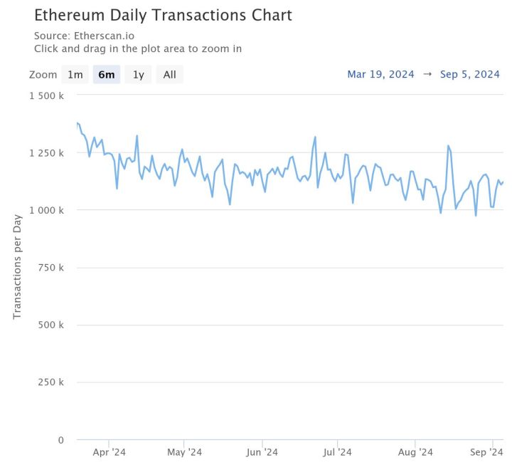 Pivoting to Ethereum data, we see a similar trend. The Ethereum daily transactions chart shows a slight decline in daily transactions, from approximately 1.37 million on March 19, to 1.12 million on September 5.