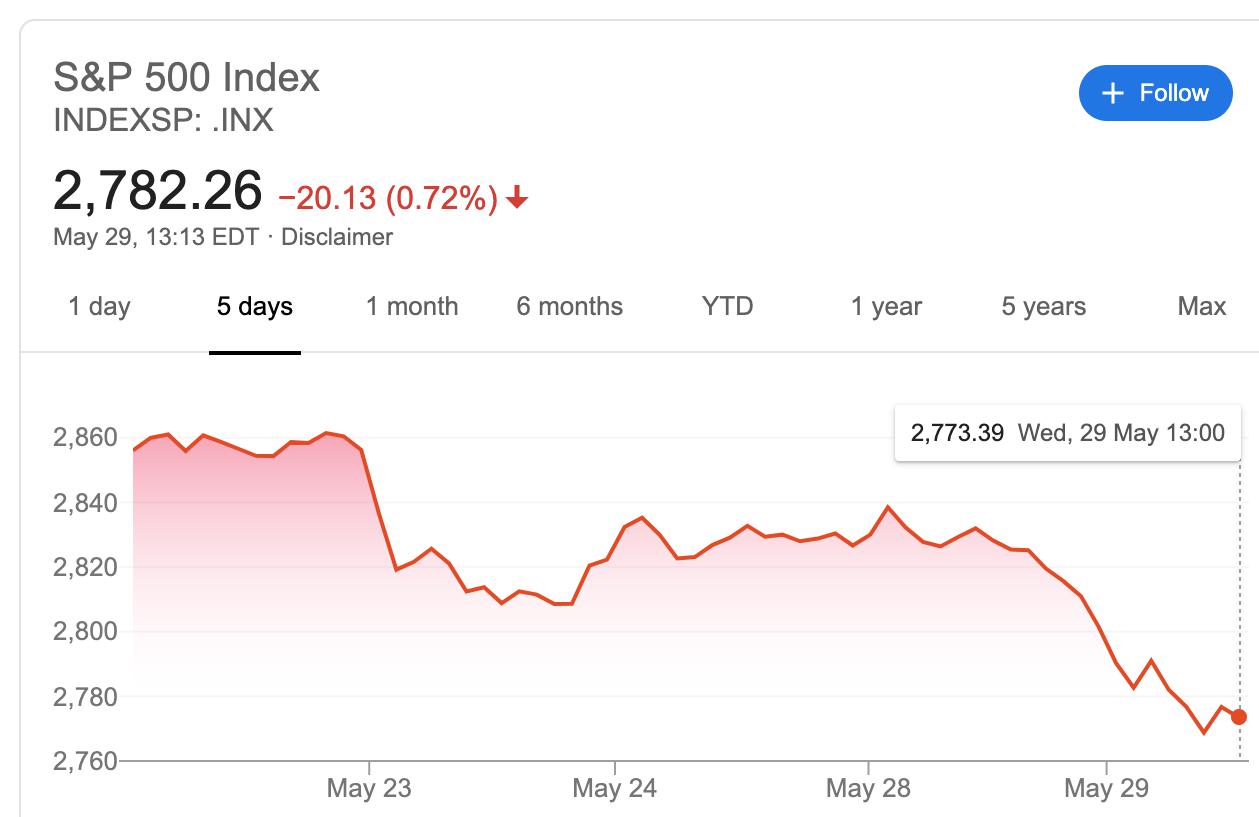 It now appears that the situation is going from bad to worse. The S&P 500 index is currently trading at around 2,769, recording losses of 32 points on the day or about 1.1 percent.
