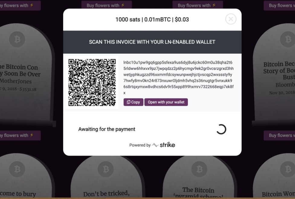 - Show the world the power of the Lightning Network ⚡️ by allowing people to buy flowers to lay next to any tombstone and also leave a note of condolence.