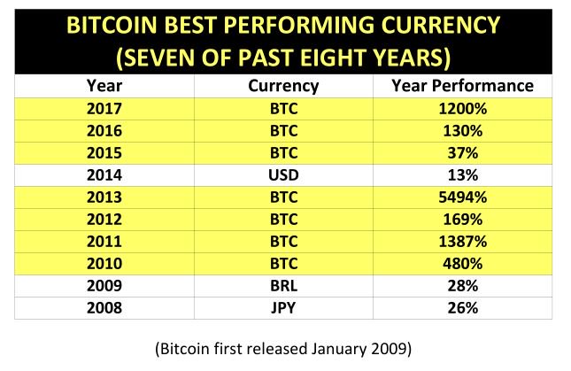 Bitcoin was the best-performing currency in the world for a seventh time in 2017, beating major cryptocurrencies and all fiat yet again.*