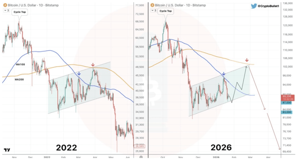 In his technical analysis released on X, Crypto Bullet revealed that Bitcoin is currently repeating a 2022 structure that could lead to a more than 20% decline in its value. To support his bearish outlook, the analyst presented a parallel chart comparing Bitcoin’s price action from 2023-2022 and 2025-2026, highlighting similar technical patterns, price behavior, and Moving Averages (MA).