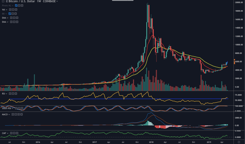 On the weekly time frame, the 12 EMA has crossed above the 26EMA. This is a first since the start of the 2017 rally and the weekly RSI has also broken into bullish territory and above the October 2015 level, which marked the end of that drawn-out bear market.