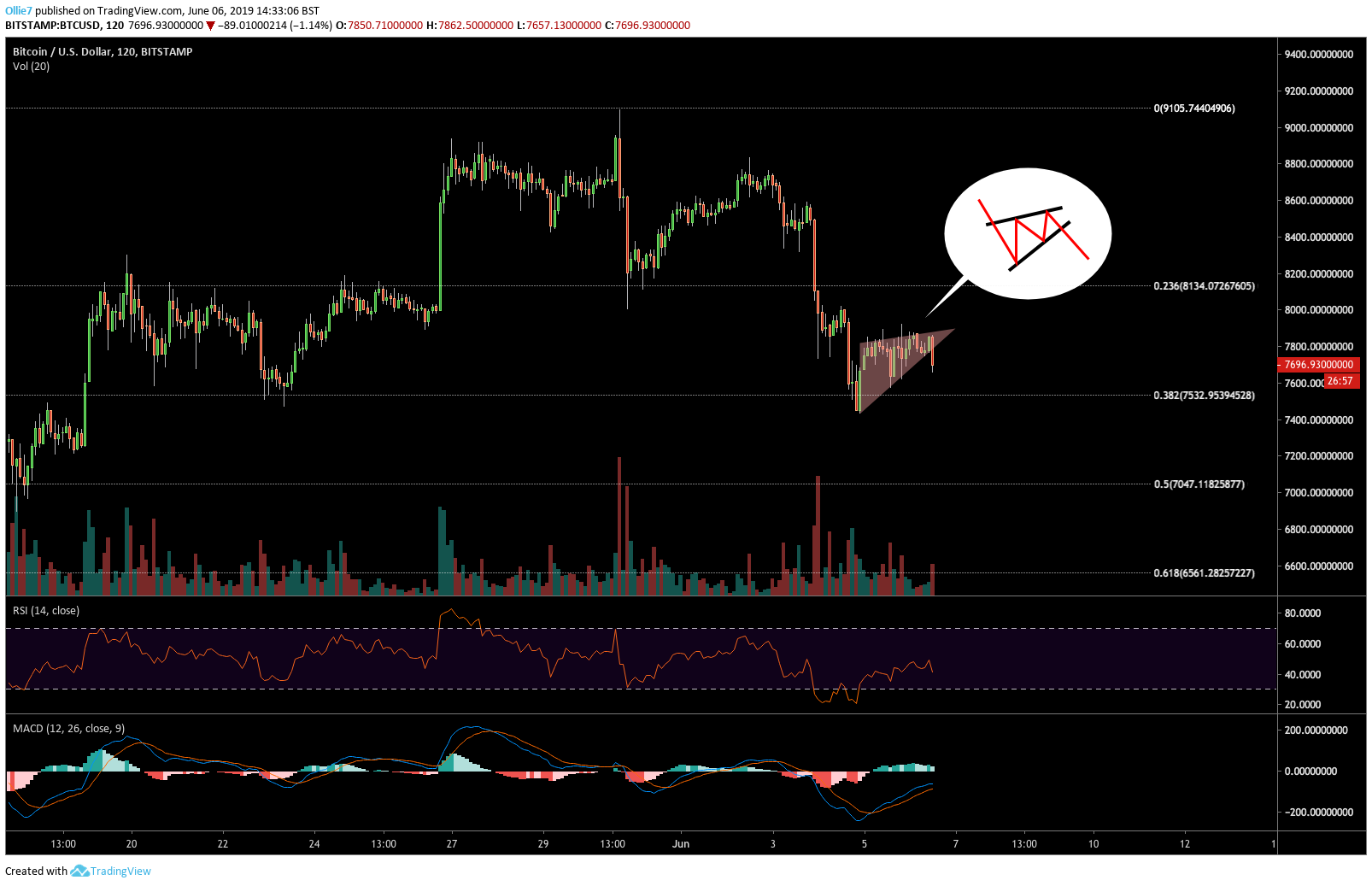 Bitcoin bears have upped their assault in the last hour, driving BTC price down $200 on to the $7,700 support below. Can bulls defend against the mounting selling pressure, or will the asset continue unraveling inside the falling wedge pattern? Let’s take a look.