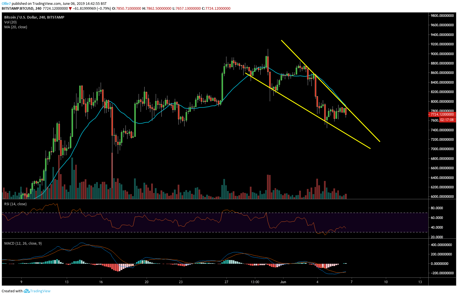 The next strong support for Bitcoin appears to sit around the $7,250 area, where the price action is most likely to meet with the downtrending support of the wedge pattern.