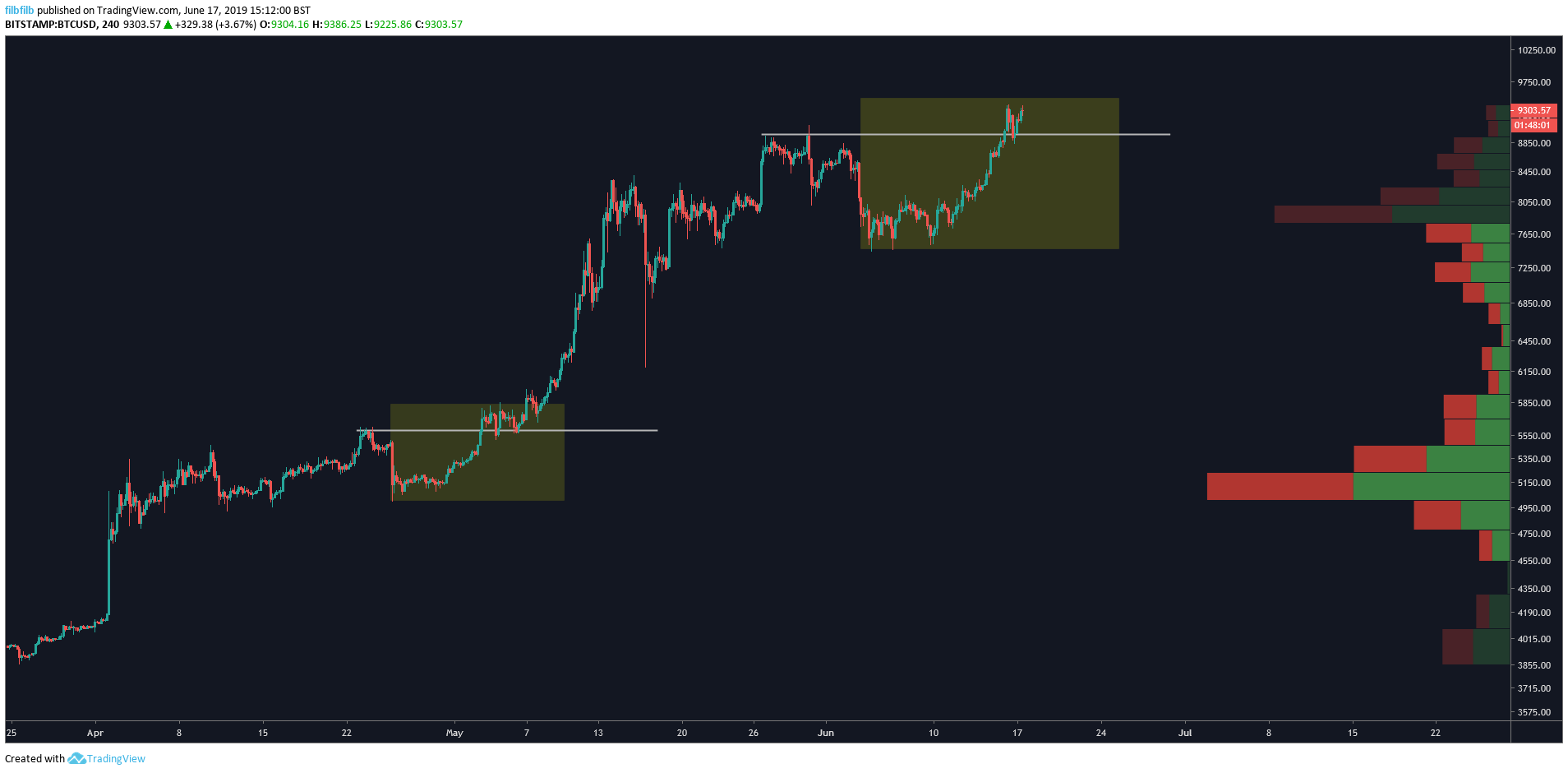 Current price action looks to be following a similar pattern to that which was seen when bitcoin was trying to break through $6k. Should bitcoin be able to continue finding support above previous highs, a similarly large move of disbelief could occur before the end of June.