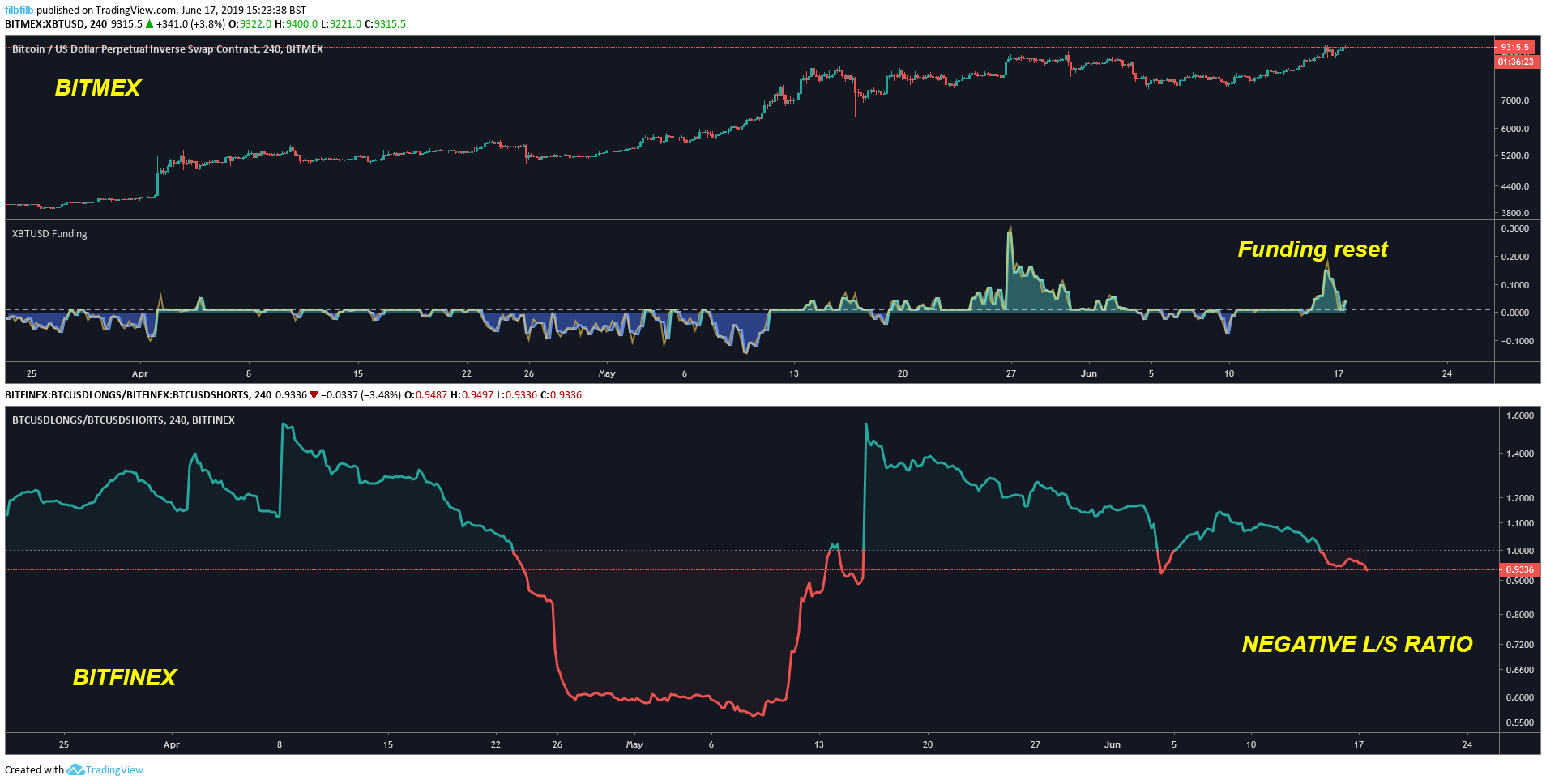 As reported in last week’s update we remarked that there was a bearish sentiment amongst leverage traders in the market with Bitmex funding being negative and the Bitfinex long-to-short ratio being at parity.