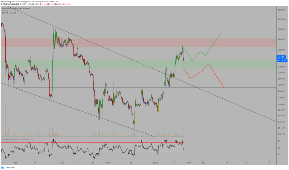 There’s no denying that on a weekly time frame, the prevailing trend since July 2019 has shifted. This was jump-started by price faking out to new lows. A few weeks later, bitcoin price is retesting old support turned resistance. Now, it’s time to be cautiously optimistic about bullish prices in the coming weeks, provided we manage to clear the lower $9000 and not lose $7700 as support. This $8400-9000 zone is a significant piece of price the bears and bulls are fighting over, and the winner will likely set the trend for the coming months into the halvening.