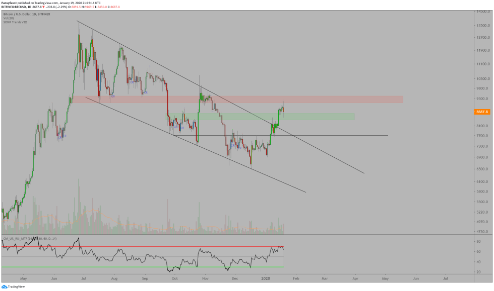 It’s been a fairly exciting week for Bitcoin bulls, with rally upon rally feeding into the bullish sentiment. Although the weekly is not closed as of typing, Bitcoin saw its value jump 14% this week to $9169,5(Bitfinex). However, it seems that for all the gains achieved this week, Bitcoin has found itself staring at a significant high-time frame resistance zone on the weekly and daily charts.