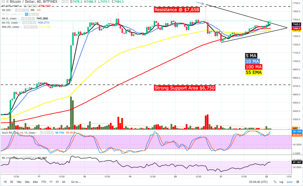 As noted on the 1-hour chart, the 20-day MA has flattened and BTC rides along the top of the 20. BTC remains above the 50 and 100-day MA, with all continuing an upward path and the most likely short-term scenario is for BTC to trade in a tightening range before attempting to overtake the $7,658 resistance for the second time.