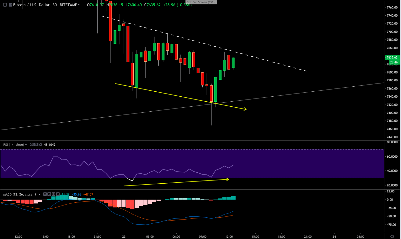 Looking at the current price of bitcoin in closer detail over a 30-minute time frame, we can see that there are actually some bullish signals, which suggest bullish traders are already beginning to launch an upside recovery.