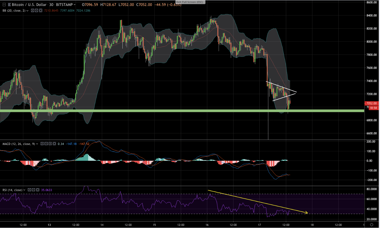 The central MA on the Bollinger Bands appears to creating strong resistance against an upside recovery, despite the asset briefly ricocheting off the $7,000 level as BTC dipped into the oversold region on the RSI.