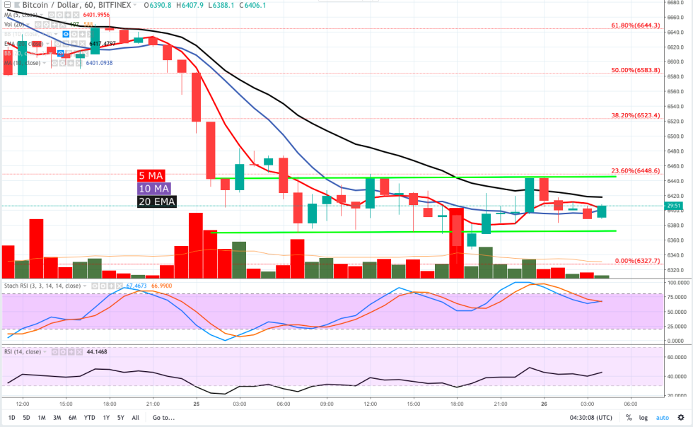 The 4-hour and daily chart also suggest that $6,350 could serve as a demand zone and the 1-hour chart (above) shows BTC consolidating below the 20-MA of the Bollinger band indicator as the 5-MA slowly creeps above the 10-MA.