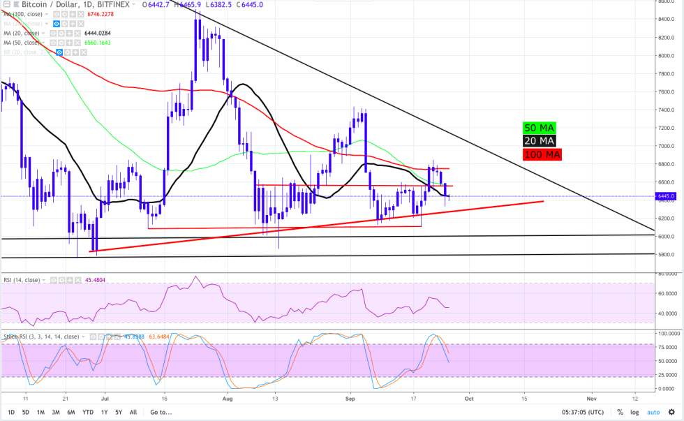The $6,448 mark is currently functioning as a short-term resistance and $6,360 is interim support. The daily chart also shows $6,557 as a point of resistance and BTC would need to drop below $6,227 to trade below the ascending trendline.