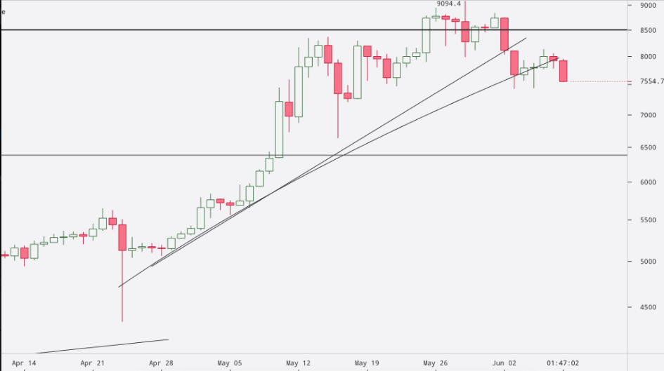 The pair had had a rocky weekend’s trading, losing around 9 percent since Friday and bottoming out at $7533. 24-hour losses totaled 2.7%, while monthly performance remains stronger at 14.4% gains.