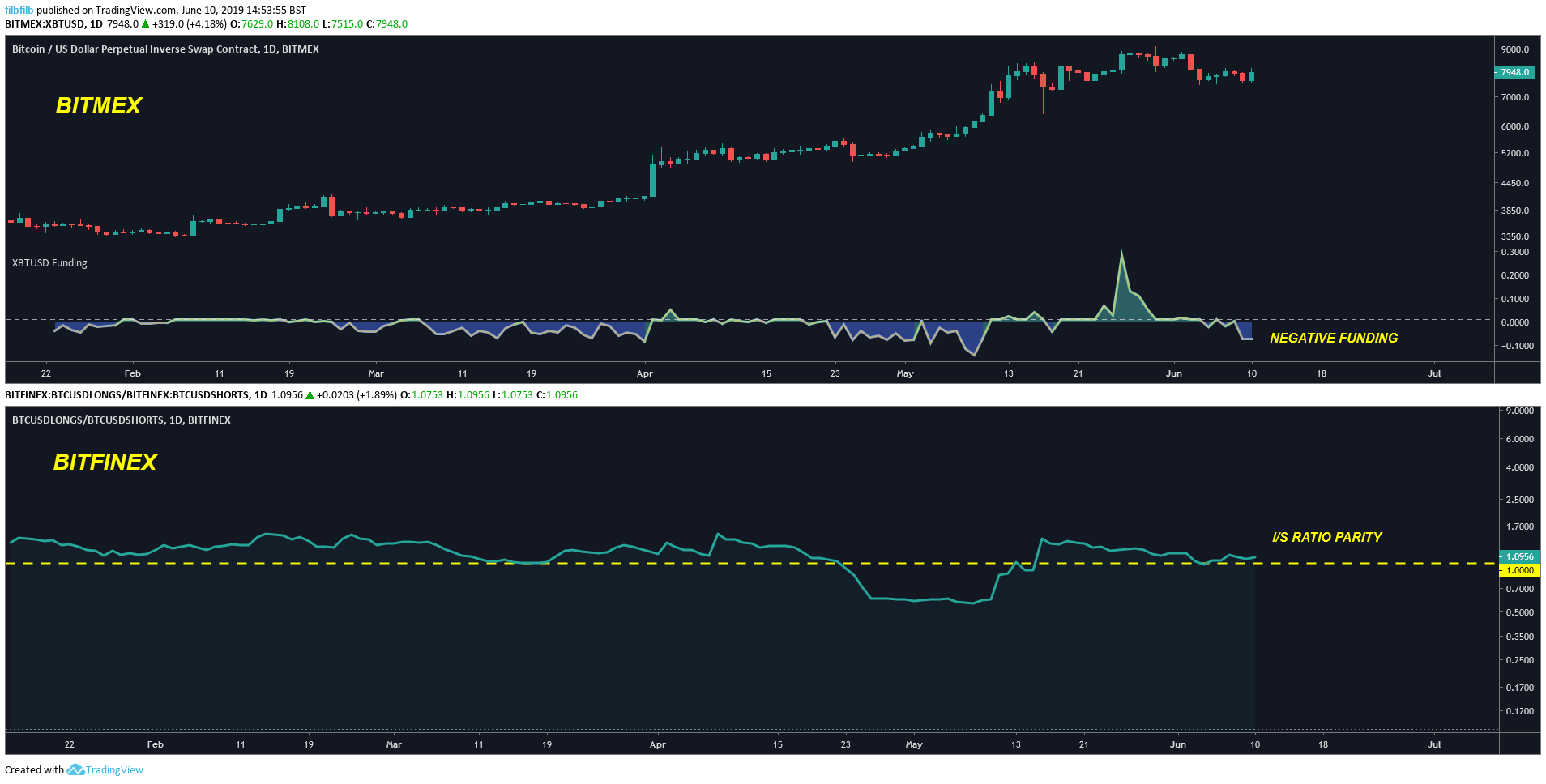The long-to-short ratio as measured by Bitfinex has come back near to parity after reaching highs of 1.55 and the funding at Bitmex is now negative, meaning that people are paying to be short bitcoin to those who are long.