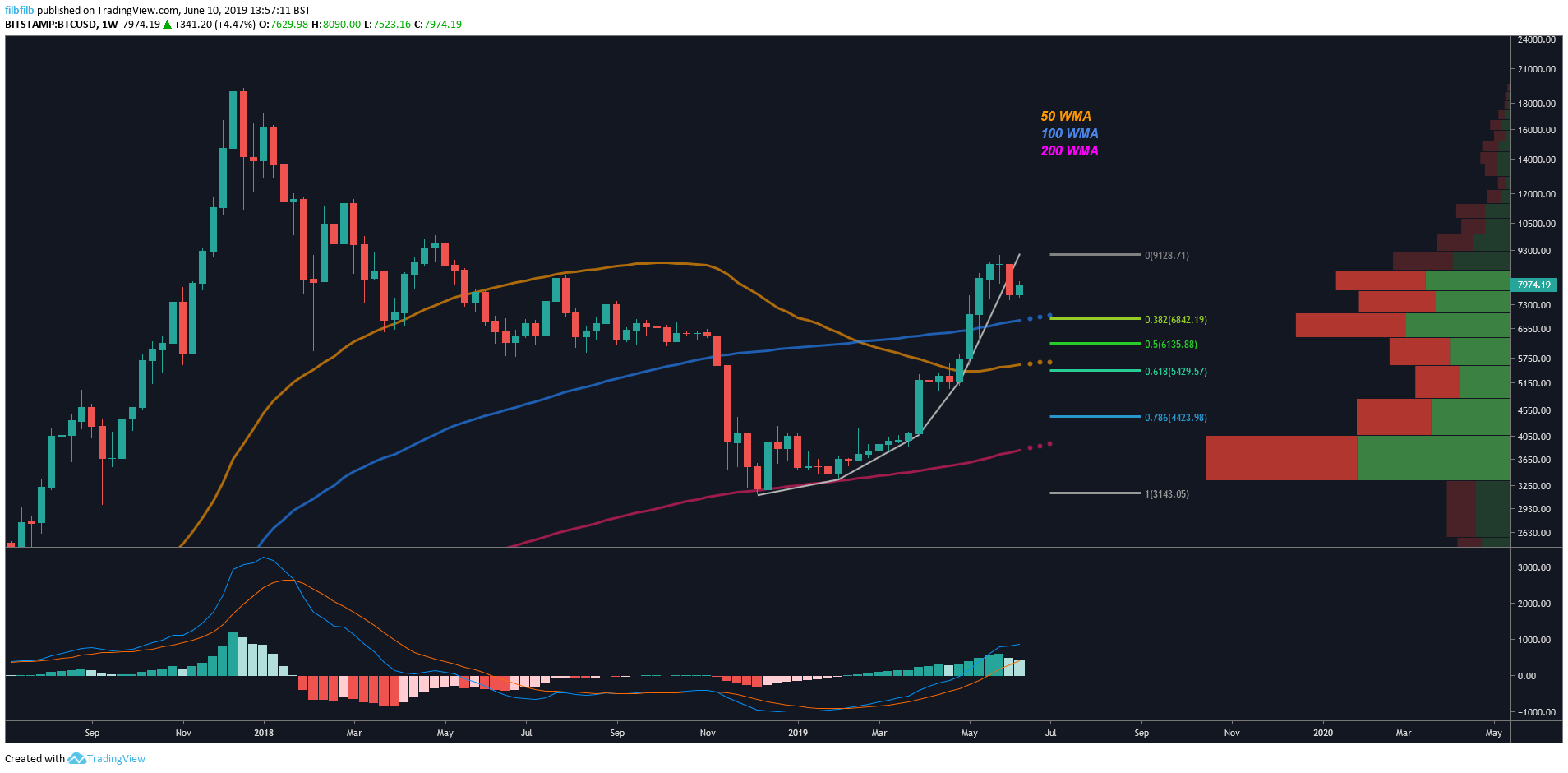 Should BTC price lose support at $7500, there is the 100 WMA and 38.2% retracement level below at $6842, which is also a high level of volume interest as shown by the VPVR. Therefore, this is likely to act as a first attempt to defend bitcoin, should we see a selloff.