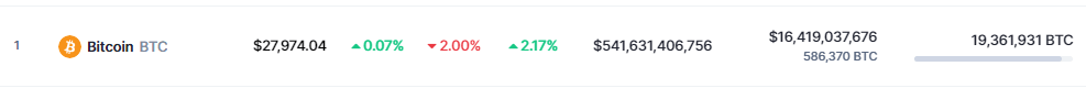 Bitcoin experienced a 2% drop in the last 24 hours, and its value, as reported by CoinMarketCap, dropped below the $28K level, and currently at $27,974. Additionally, its 2.17% increase over the past seven days indicates Bitcoin’s ability to withstand market fluctuations and remain stable.