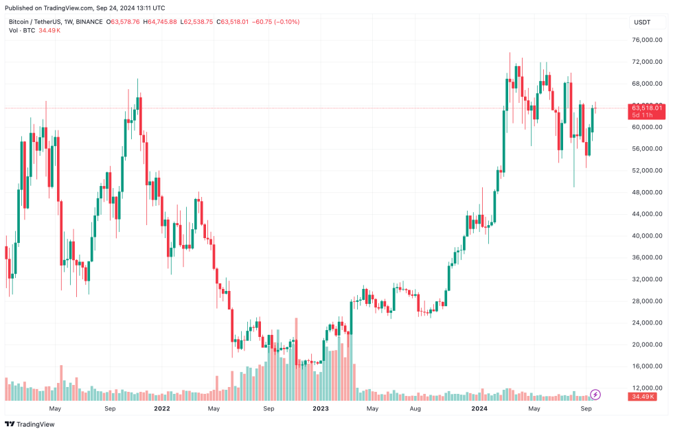 An executive from Standard Chartered Bank recently predicted that Bitcoin might reach $200,000 by the end of 2025. However, other analysts are less optimistic, noting that one major driver of Bitcoin’s past price surges—its halving cycles—might no longer be as impactful. At press time, BTC trades at $63,518, up 0.4% in the last 24 hours.