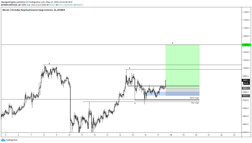 “BTC weekly close today and sitting right at resistance in $9500s. Would like to see price close at or above $9550 on weekly,” he said while pointing to the chart seen below.