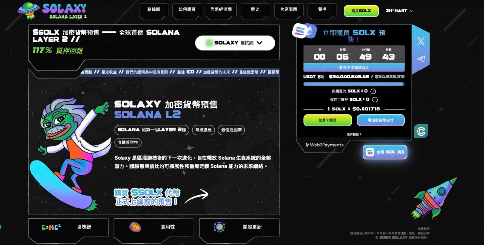 Solaxy ($SOLX) 是 Solana 生態系統急需,因此該幣位居 Solana 迷因幣預售列表首位。簡而言之,它提供了一個 Layer 2 解決方案,能大幅減少擁堵、消除停機時間並加快交易速度。它快速、高效,準備將 Solana 推向下一個層次。