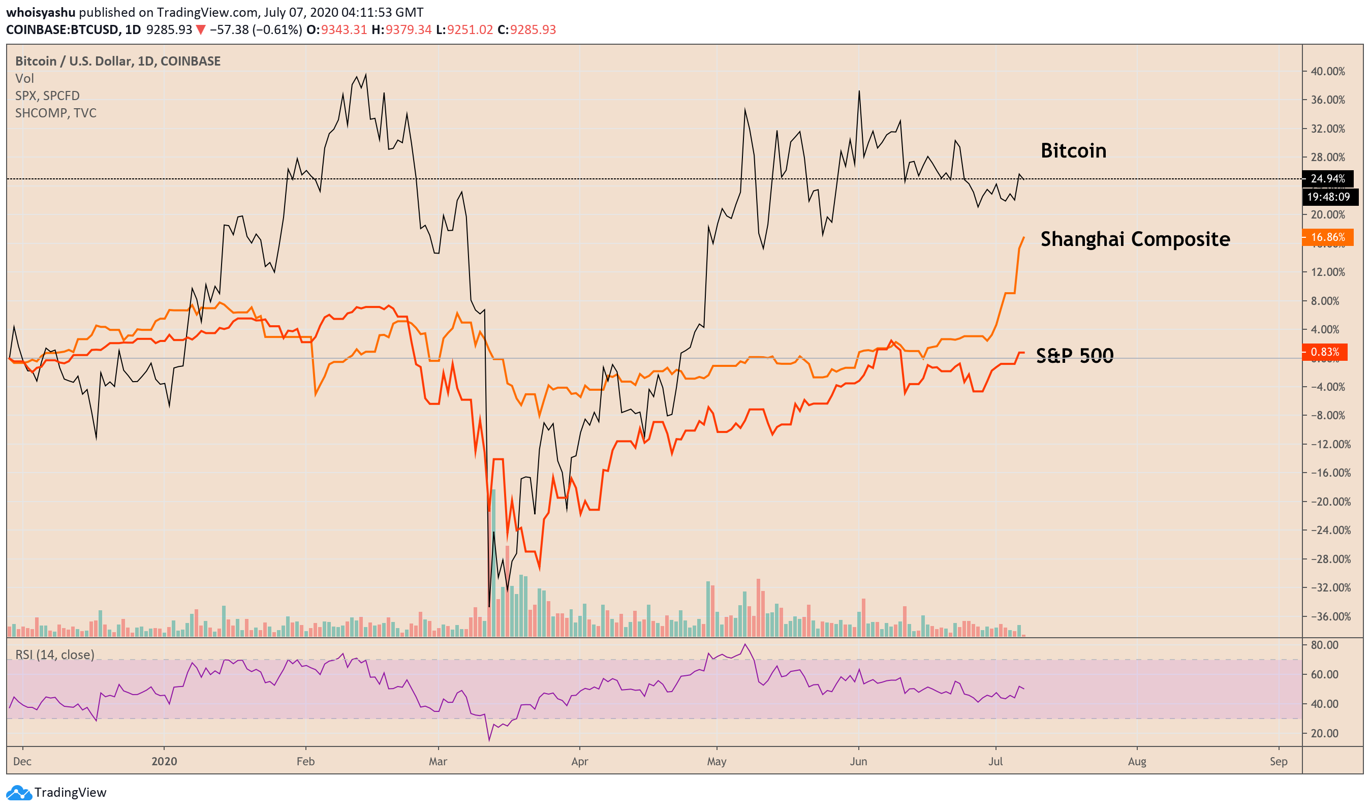 Bitcoin has more or less tailed the stock market‘s plunge and jumps in the last three months. The cryptocurrency tends to do the same heading further into Q3.