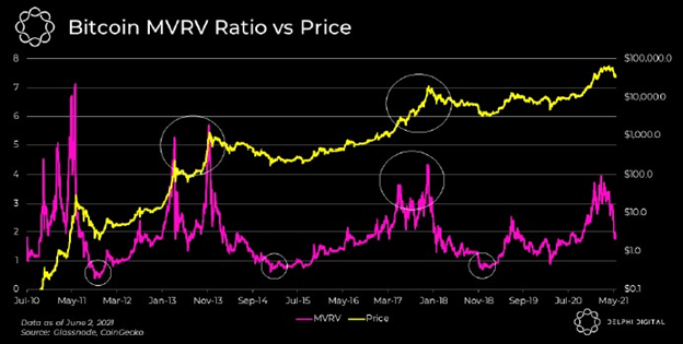 According to the report, the MVRV ratio in May 2021 is similar to those in early 2011, late 2013 and early 2018. In these periods, Bitcoin price made ATHs before falling hard.