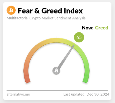 The Greed Index is a popular measure of Bitcoin’s or other token’s market performance in terms of market sentiment. Although a score of 65, based on the tracker’s December 30th update, reflects “Greed,” this is the digital asset’s lowest score since October 15th.